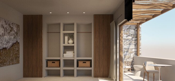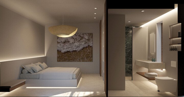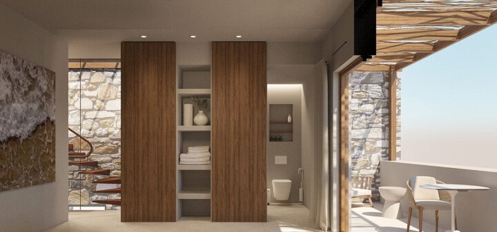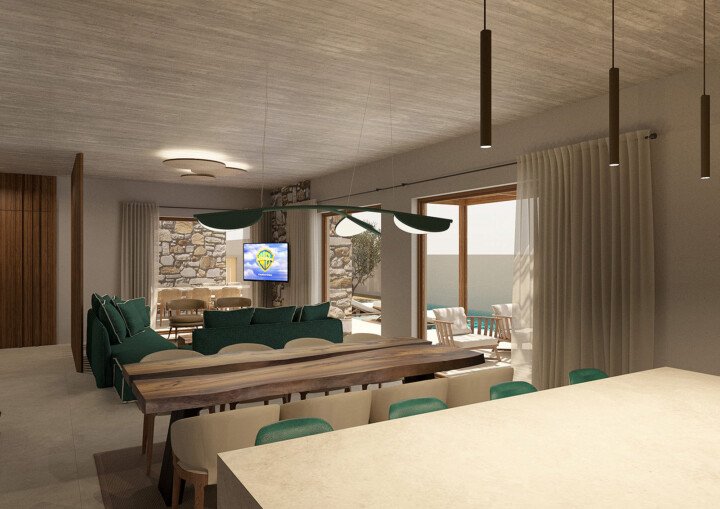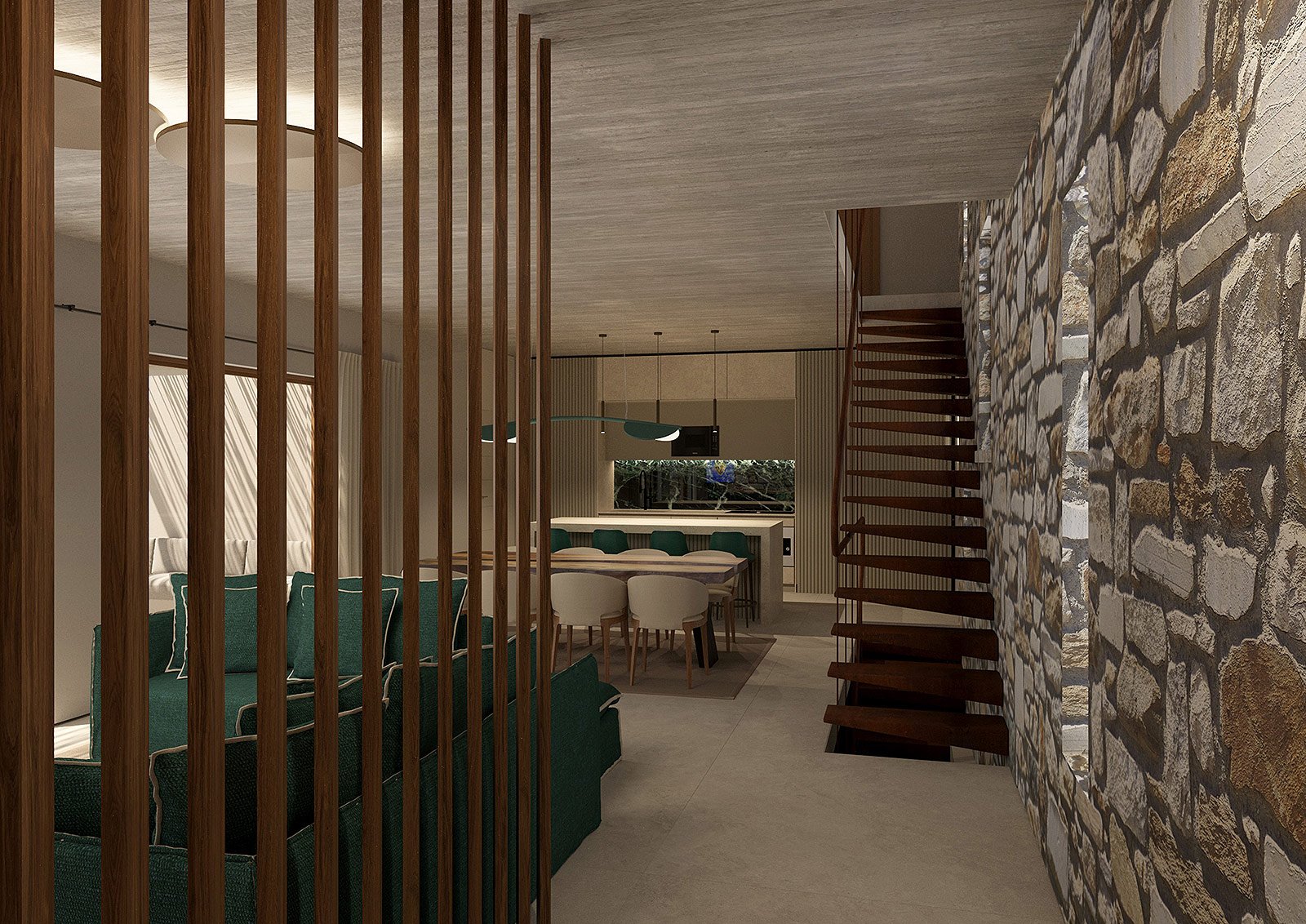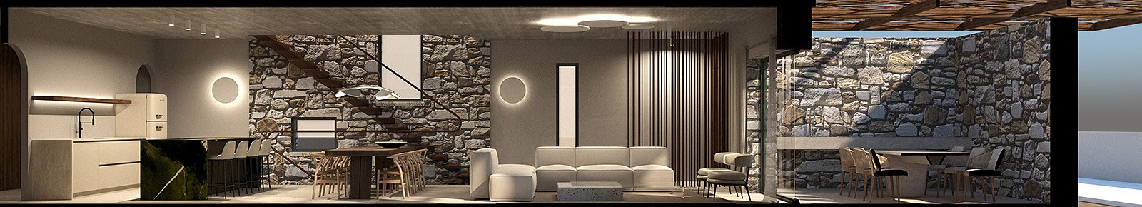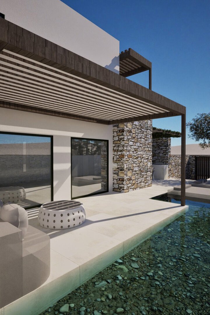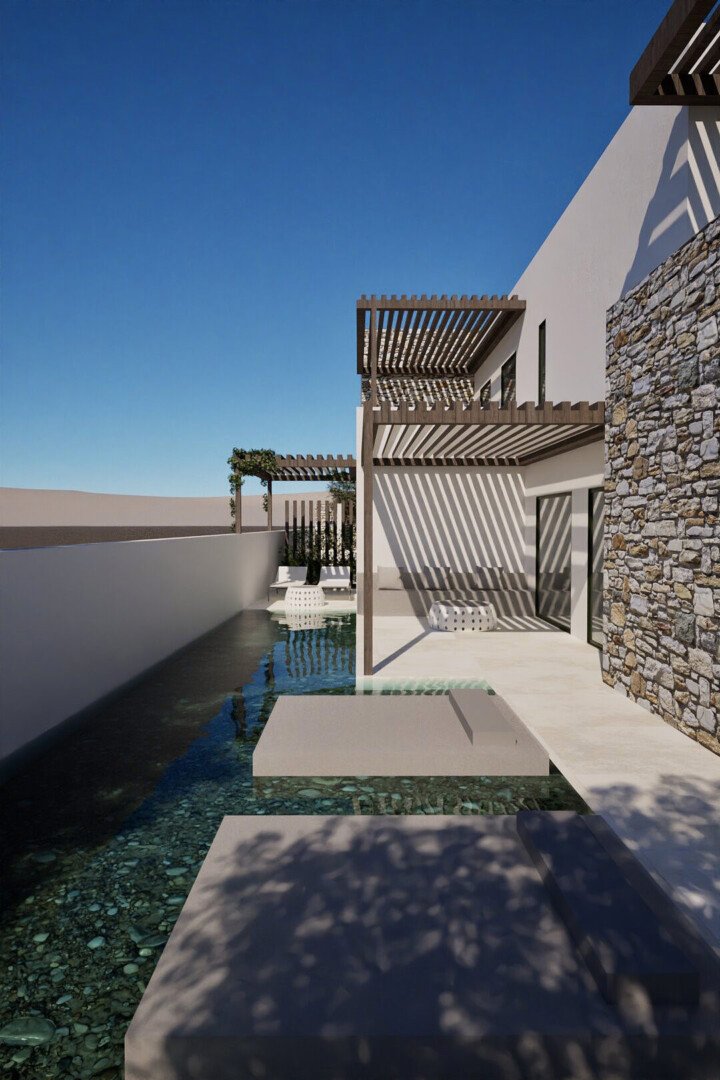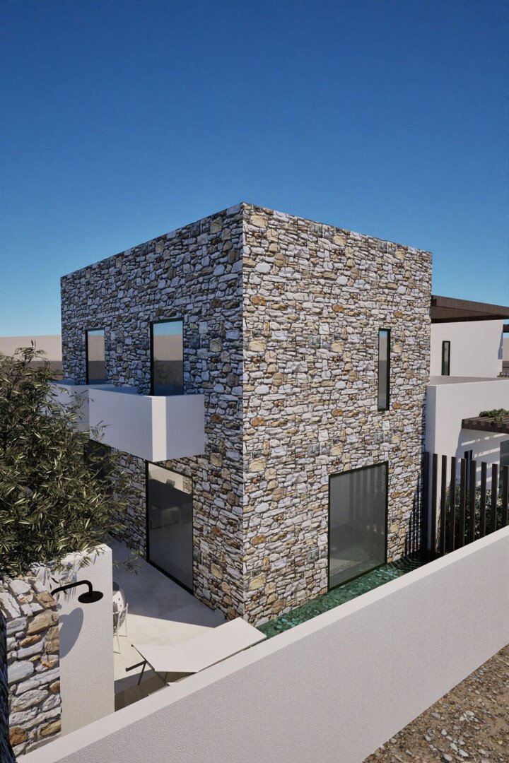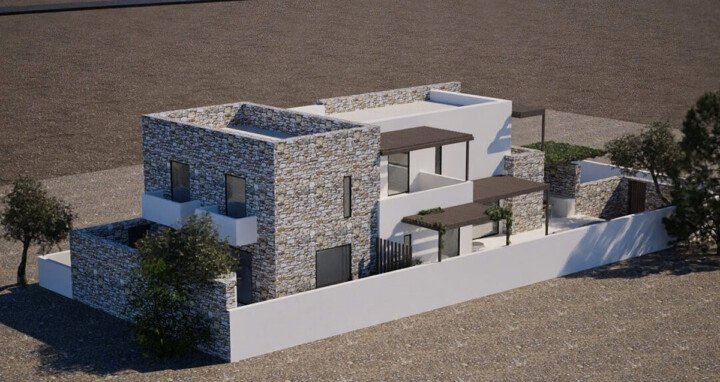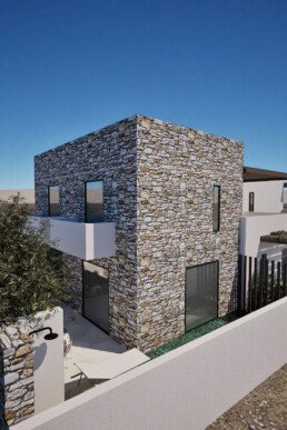 Η μελέτη αφορά δύο νέες κατοικίες επιφάνειας 150 τ.μ. και 70 τ.μ. , με υπόγειο και πισίνες, εξελίσσονται σε τρία επίπεδα στο οικόπεδο, εκμεταλλευόμενοι την θέα στο Αιγαίο Πέλαγος.