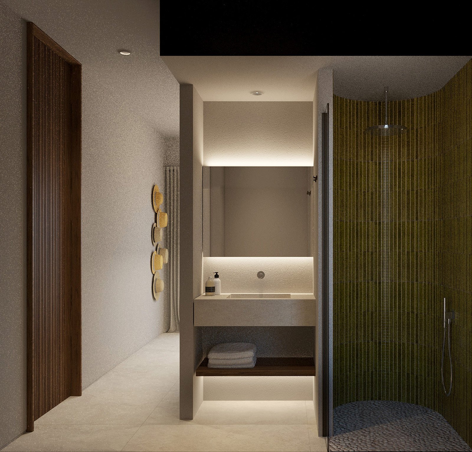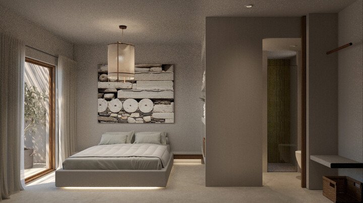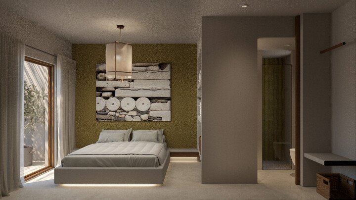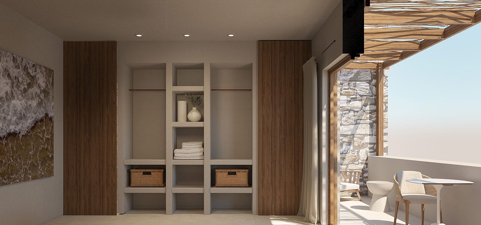 Η αρχιτεκτονική επιλογή, υπαγορεύεται από τον χαρακτηριστικό παραδοσιακό τοπικό σχεδιασμό των κτηρίων και υποδηλώνει το σεβασμό στο φυσικό τοπίο.