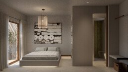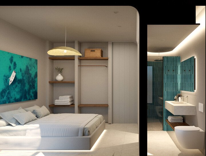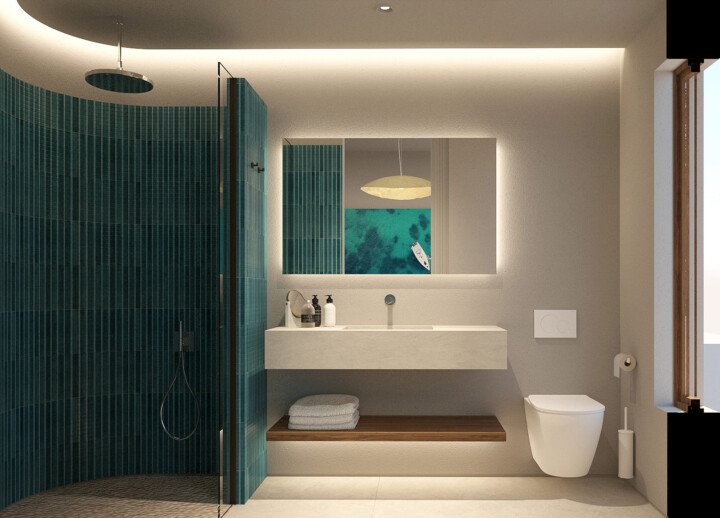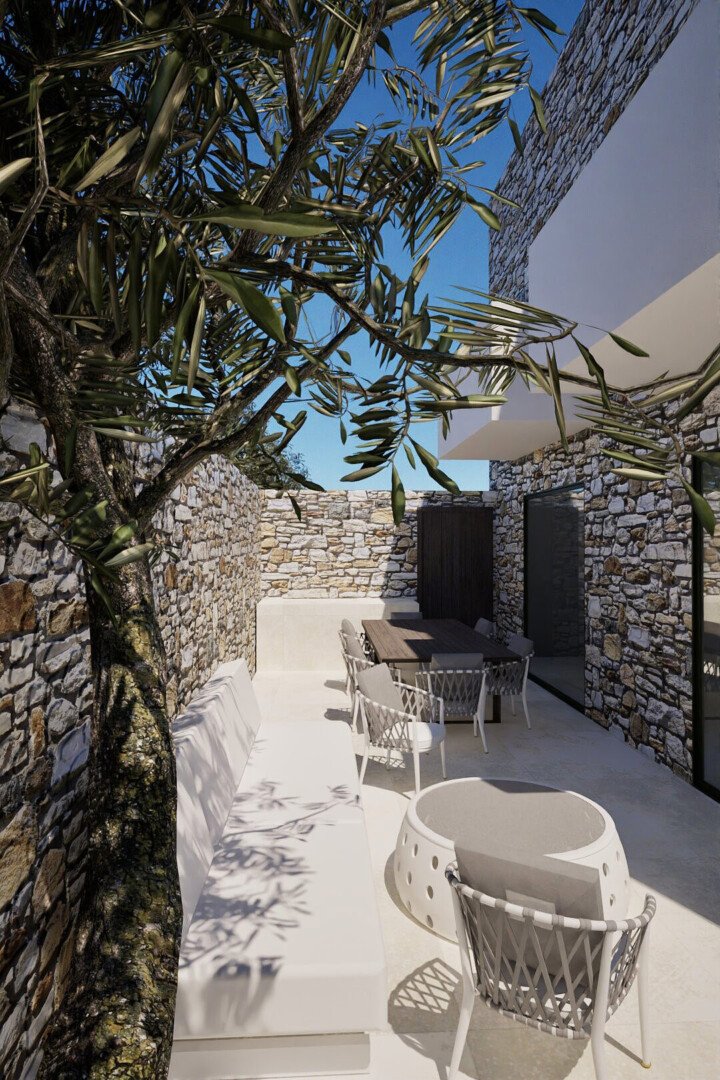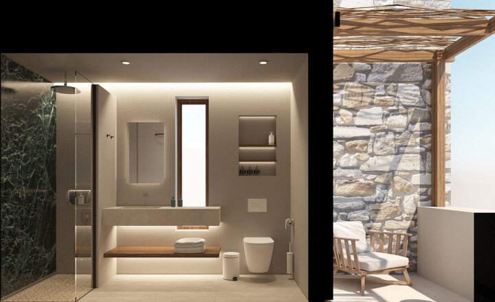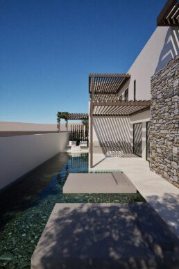 Τhe study concerns two new residences of 150 sq.m. and 70 sq.m., with basement and swimming pools, developed on three levels on the plot, taking advantage of the view of the Aegean Sea.